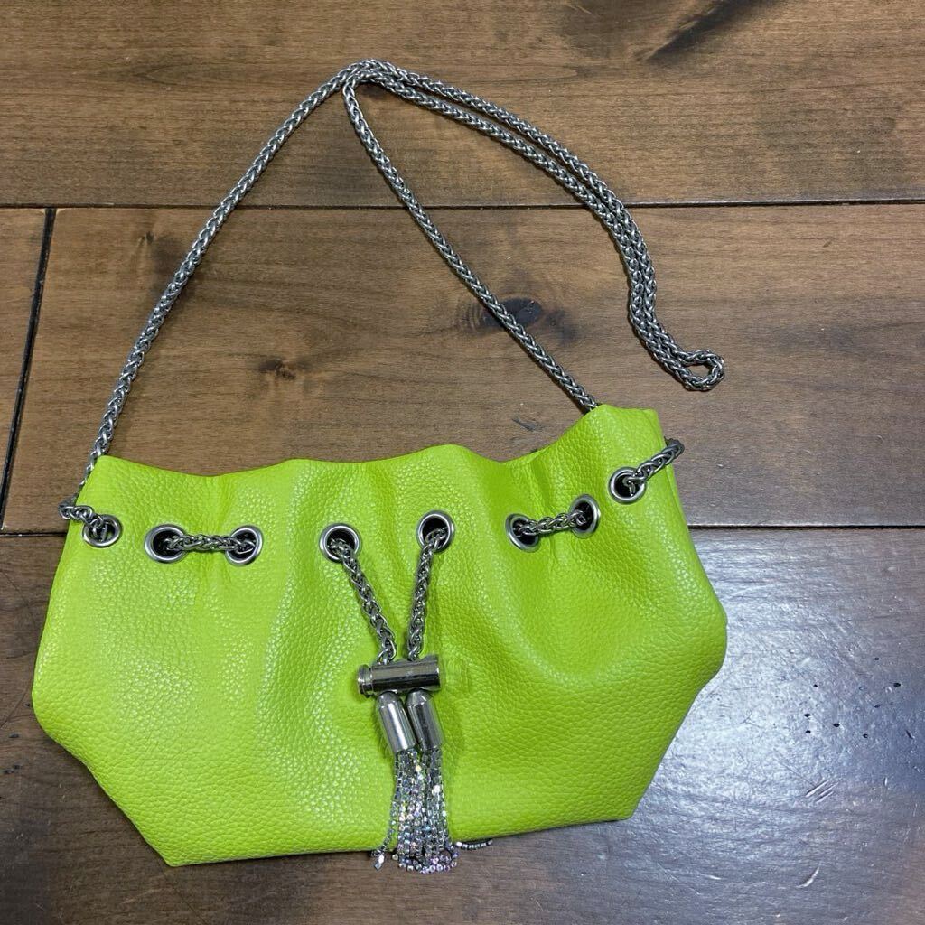 - チェーンショルダーバッグ ネオングリーン ミニバッグタッセル飾り ドローストリングデザイン バケットバッグ