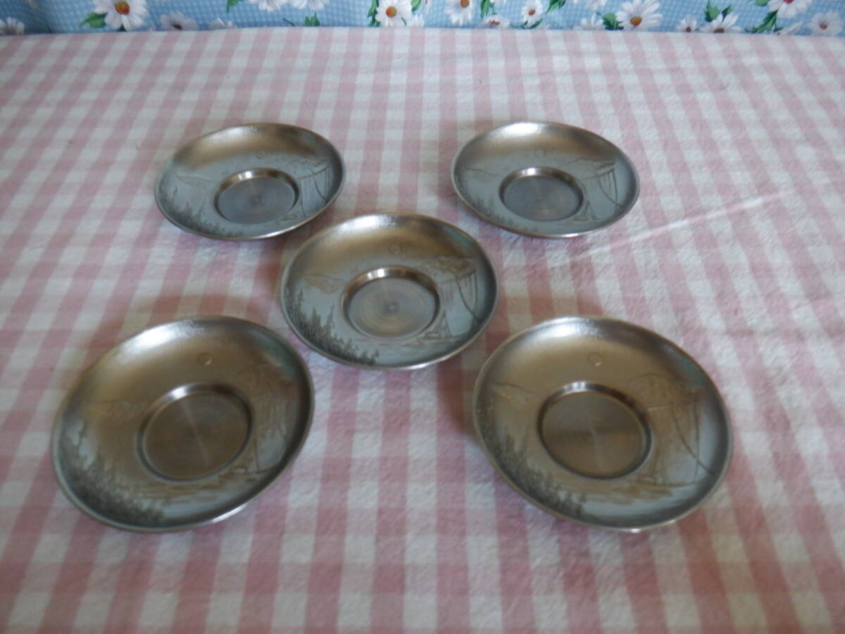 - D8『昇峰 錫(すず)製 御茶托~5枚セット 帆掛け船から眺める山並みの風景』~木箱入り 伝統工芸 和食器 茶道