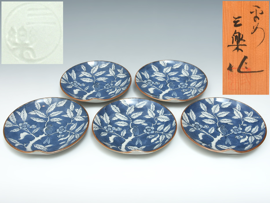 - 平安三楽 (造) 青華花鳥絵皿 5客揃 共箱 銘々皿 未使用 陶磁器 京焼 清水焼 染付 茶道具 会席道具 懐石 和食器 なます皿 z7984a