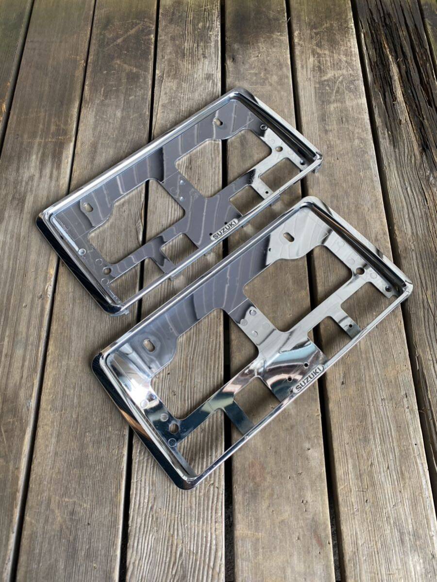 > SUZUKI スズキ ナンバーフレーム 純正 中古 当時物 ナンバー枠 メッキ シルバー 前後 2枚 セット フロント リア 日本車 旧車 JDM カスタム