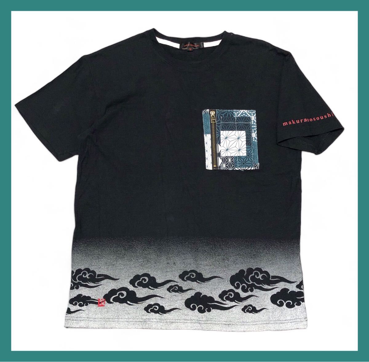 - 2109◆枕草子 makuranosoushi マクラノソウシ◆和柄切替 コットン 半袖 Tシャツ ブラック×ホワイト×ネイビー M