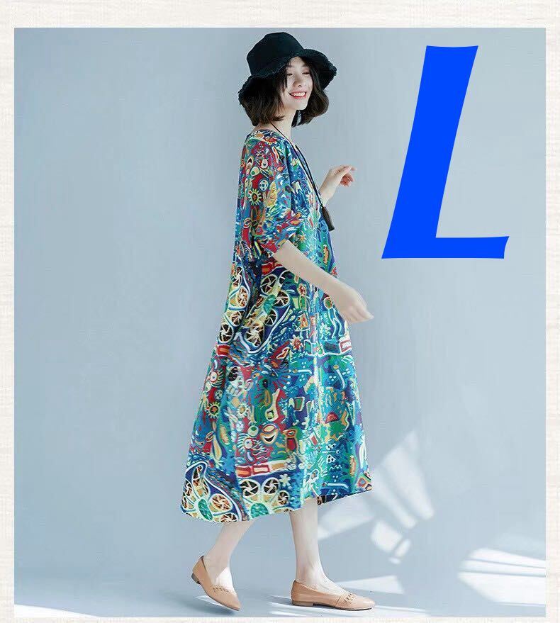 - ワンピース アジアン マキシ丈 ロングワンピース 半袖 エスニック Lサイズ アースカラー 女性用ドレス L