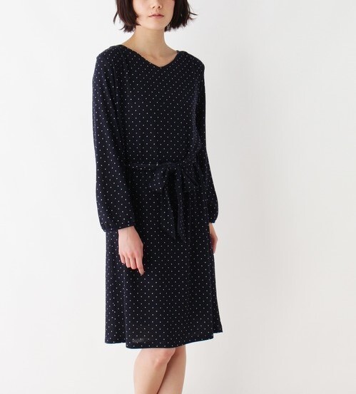 - ラスト 新品 GROVE リボンベルトドットワンピース ネイビー(193) 03(L) 定価3289円