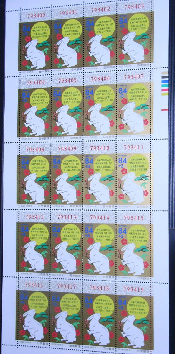 > ★新品★令和5年★2023年用 うさぎ年年賀切手★84円+3円=87円寄付金付き切手20枚(1シート)★カラーマークCM右★