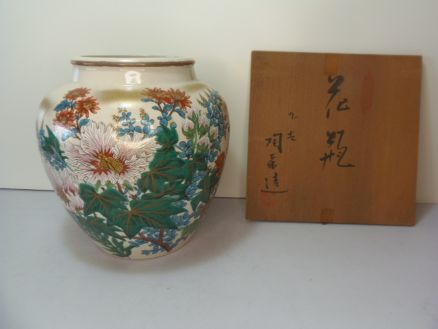 - k315 【九谷焼 九谷陶栄】 花瓶 花文様 ※難有(底に傷・中汚れ有)【同梱不可】