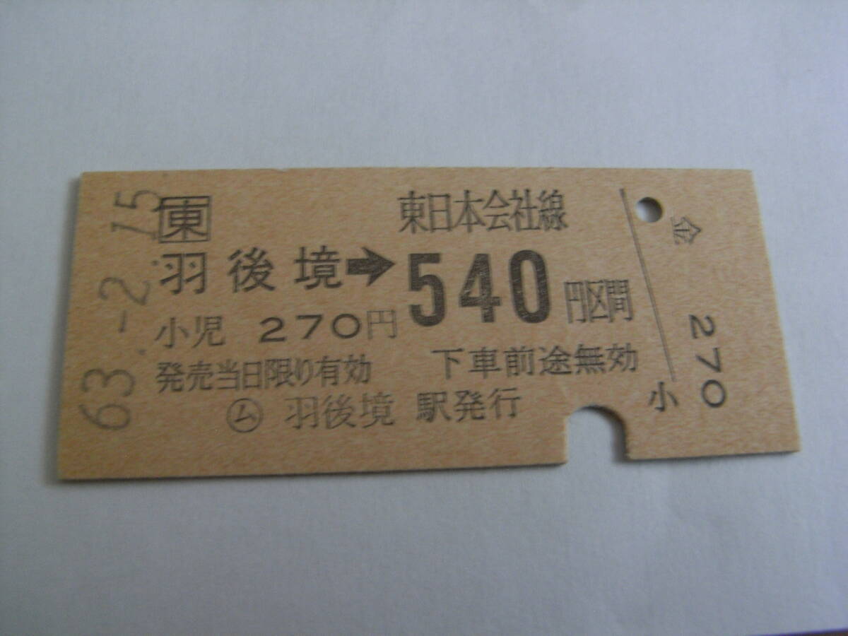 - 奥羽本線 羽後境→東日本会社線540円区間 昭和63年2月15日 ム 羽後境駅発行