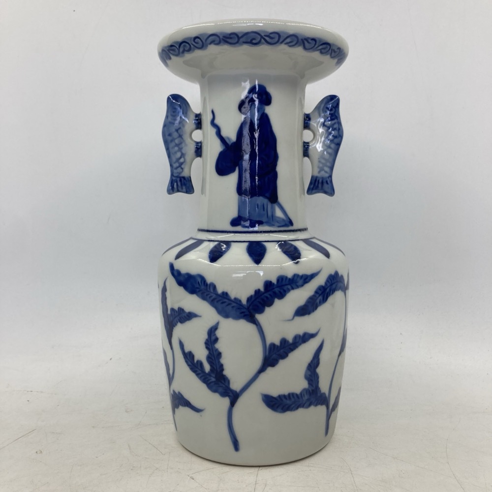 - 染付 高砂花生 花入 花瓶 大明天啓年製 双魚耳付 箱付き★K2085Z