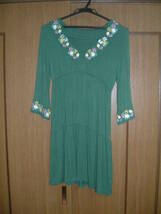 - グリーン 花刺繍 ティアード ストレッチ チュニック フォークロア