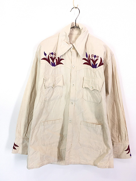 > 古着 70s エクアドル製 LAMA LINE 花 フラワー 4ポケット ボックス コットン ハンドメイド シャツ ジャケット XL位