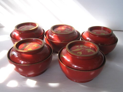 - レトロ 古い朱色の蓋付き漆器椀 漆器の汁椀 おわん 朱色 まとめて5客 天然素材 古民具 小道具 /15N23.10-12