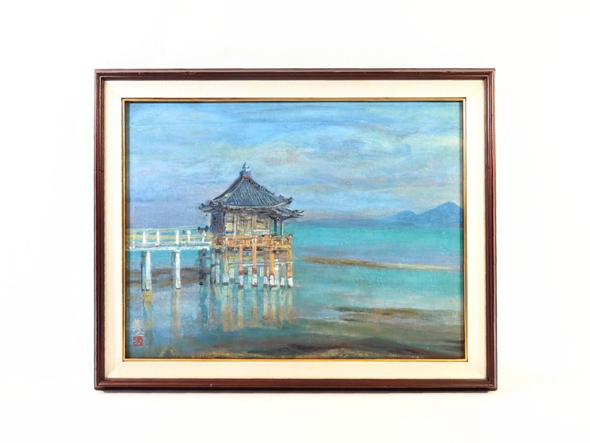 > 真作 加藤美代三 大作日本画「浮御堂」画寸 15号 兵庫県出身 朴土グループメンバー 滋賀県大津市、満月寺 近江八景「堅田の落雁」9647