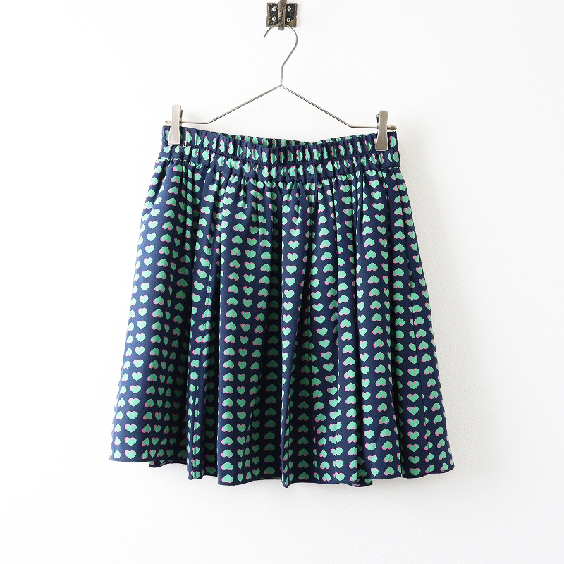 - 美品 マークジェイコブス MARC JACOBS ハートプリント シルク100% ギャザーフレアスカート XS/ネイビーグリーン【2400014019087】