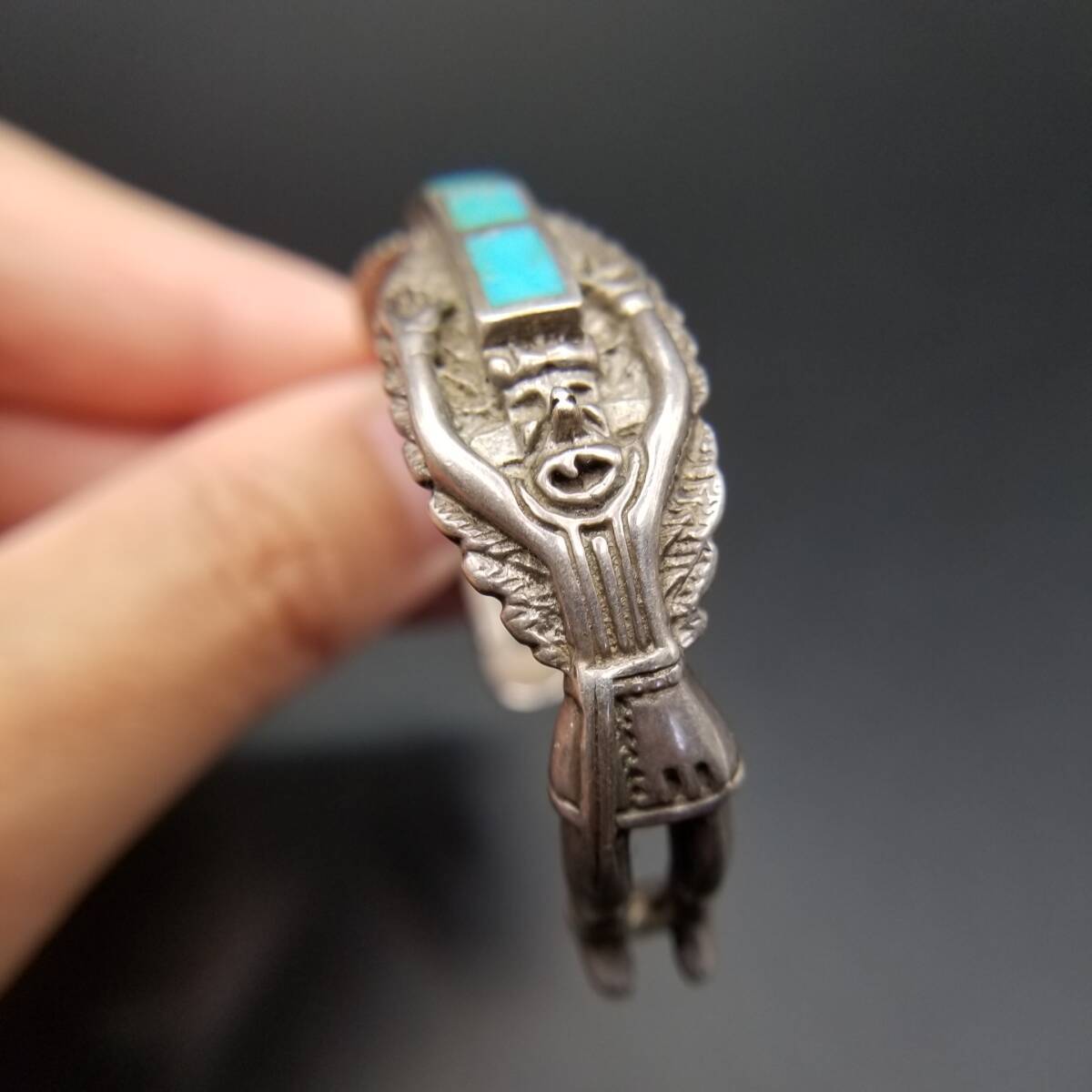 > 騎士 人の彫刻 ターコイズ インレイ ヴィンテージ シルバー カフ ブレスレット 民族的 トライバル 個性派ジュエリー Y19-F