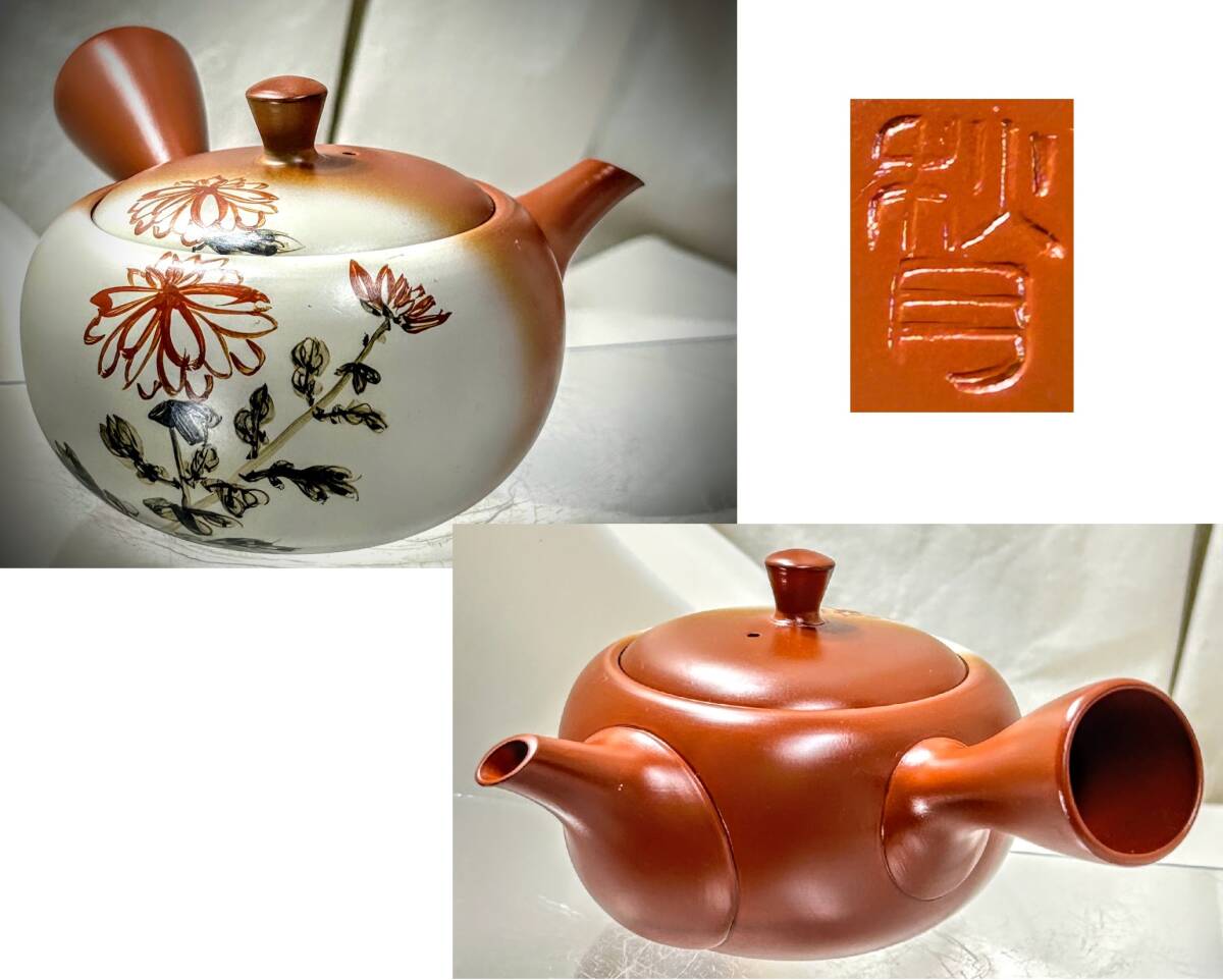 - レトロ 古い物 常滑焼 朱泥 横手急須 秋月 在銘 手描き菊花紋 茶器 煎茶道具 used 未使用 コレクション 箱無 経年保管品