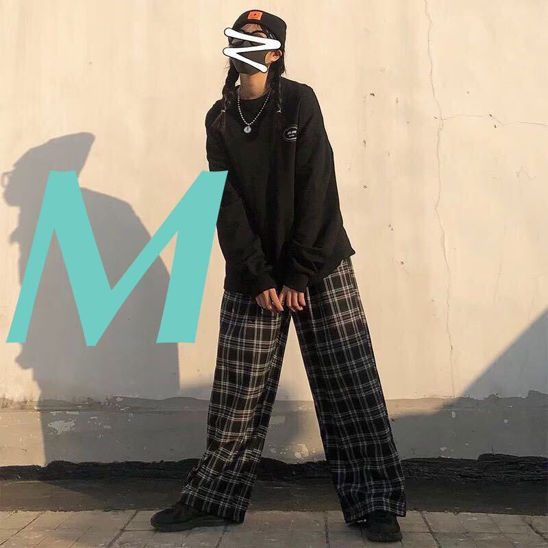 > ワイドパンツ チェック イージーパンツ ボトムス ストレートパンツ ルーズパンツ フレアパンツ メンズ レディース トレンド 黒 ブラック M