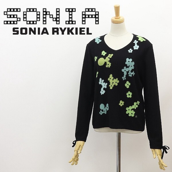 - ◆SONIA RYKIEL ソニアリキエル 花柄 袖リボン ウール ニット セーター 黒 ブラック 40
