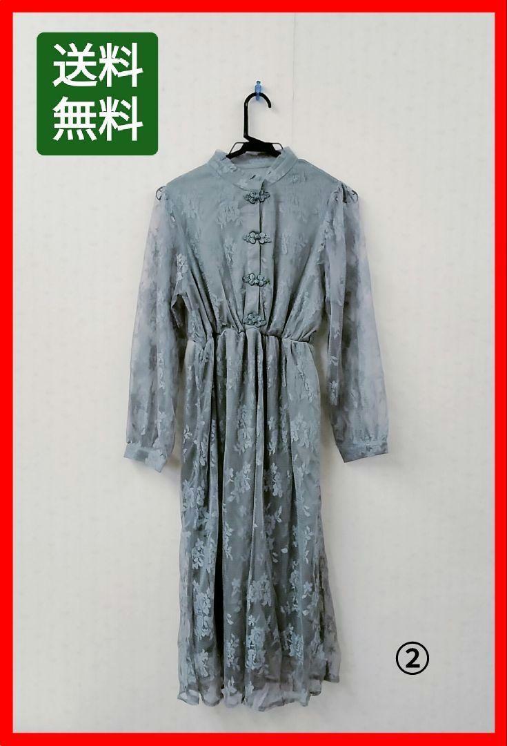 - 【送料無料】レディース チャイナ風 ワンピース レース 透感 メッシュ サックスグレー S相当 【2】