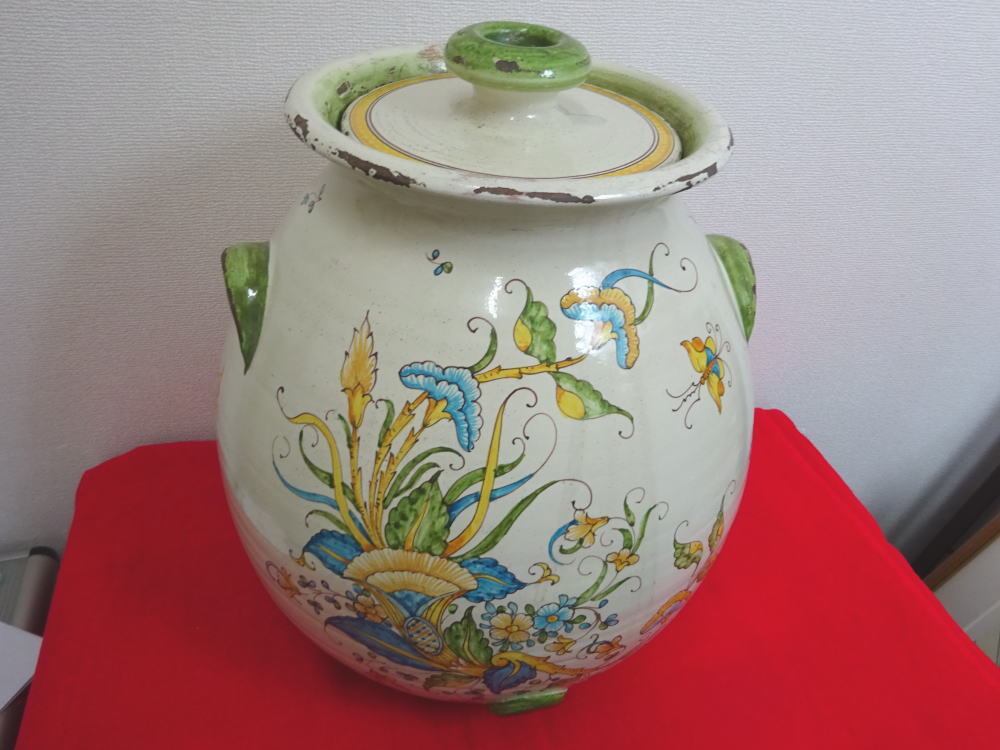 - ■□イタリア グッビオ 蓋つき 陶器 瓶 かめ 入れ物 持ち手つき 手描き 花 蝶 インテリア □■