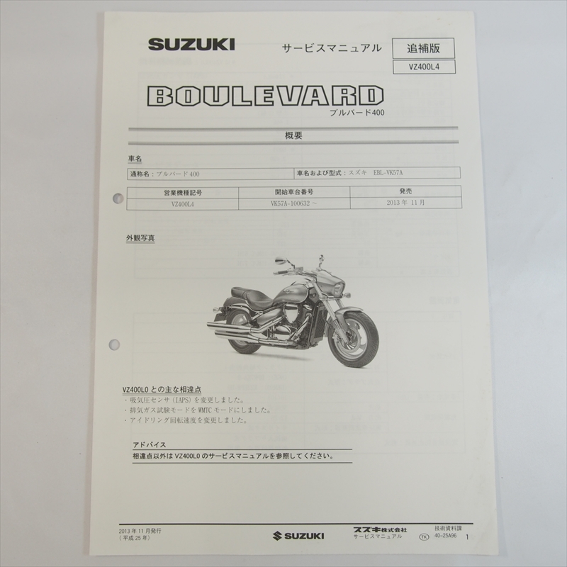 > ブルバード VZ400L4 スズキ 追補版サービスマニュアル VK57A 2013年11月発行 全3ページ 配線図無し SUZUKI