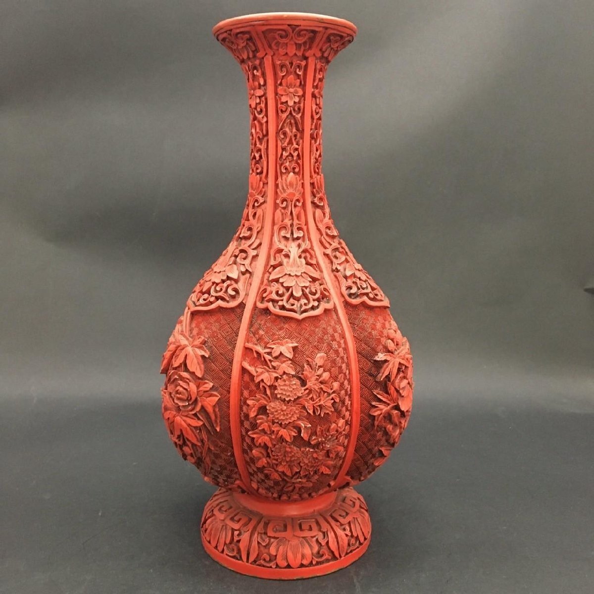 - ER0923-10-5 中国美術 堆朱 漆器 花瓶 中国古玩 花器 花入れ 彫刻 壺 唐物 時代物 骨董 骨董品 H32cm 口径8.5cm 80サイズ