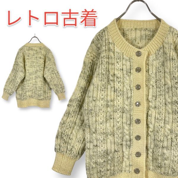 > 昭和レトロ 古着 ニット ロング カーディガン ゆったりサイズ 総柄 ケーブル編み 手編み ハンドメイド 特注品 白/グレー 匿名配送