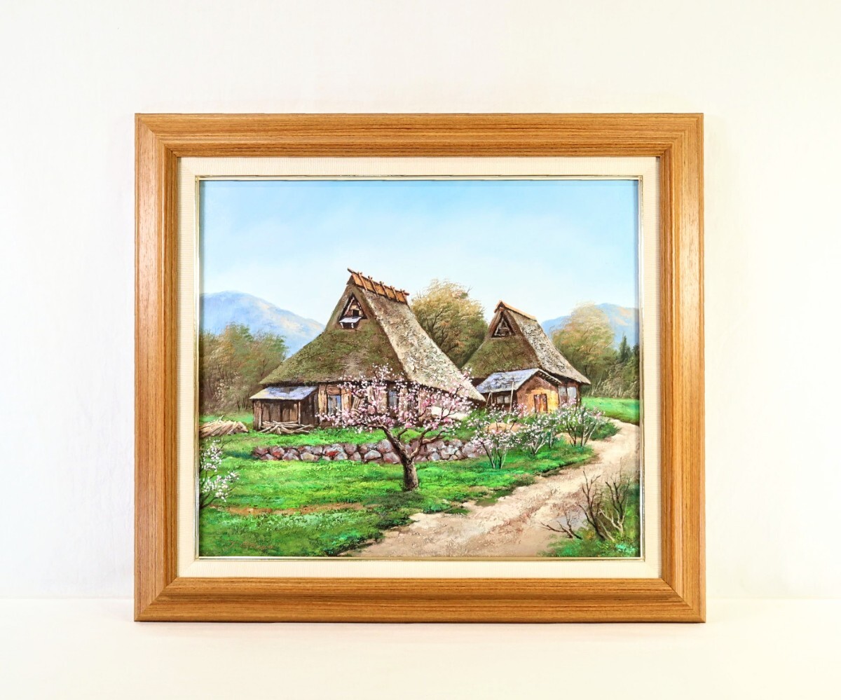 - 真作 岡田泰司 油彩「丹波路」画寸 F10 大阪府出身 個展で活動 梅の花綻ぶ茅葺き屋根のある初春の山里風景 丁寧な筆致で郷愁漂う 9799