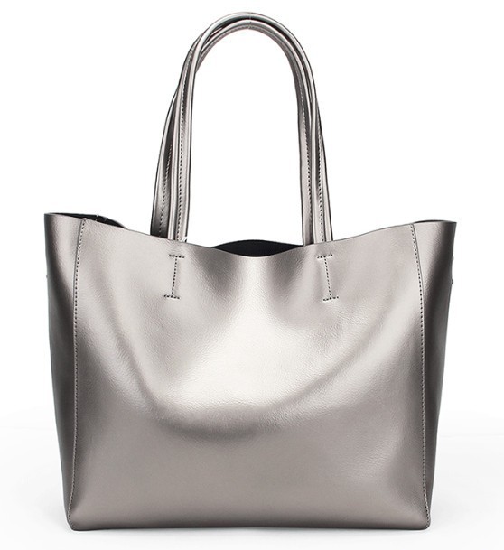 - 高級本革 レディーストートバッグ牛革 2WAYカジュアル ハンドバッグ ビジネス ハンド 大容量 レザートートバッグ ポーチ付き C73 シルバー