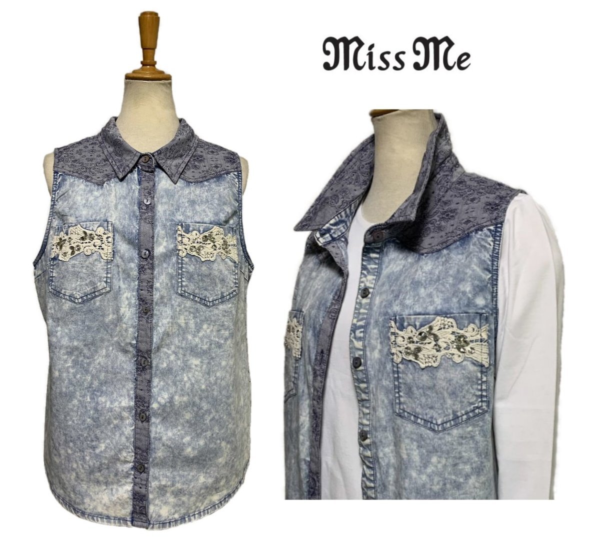 - Miss Me ミス ミ― ノースリーブシャツ デニムベスト ポケット刺繍レース&ビジュー L
