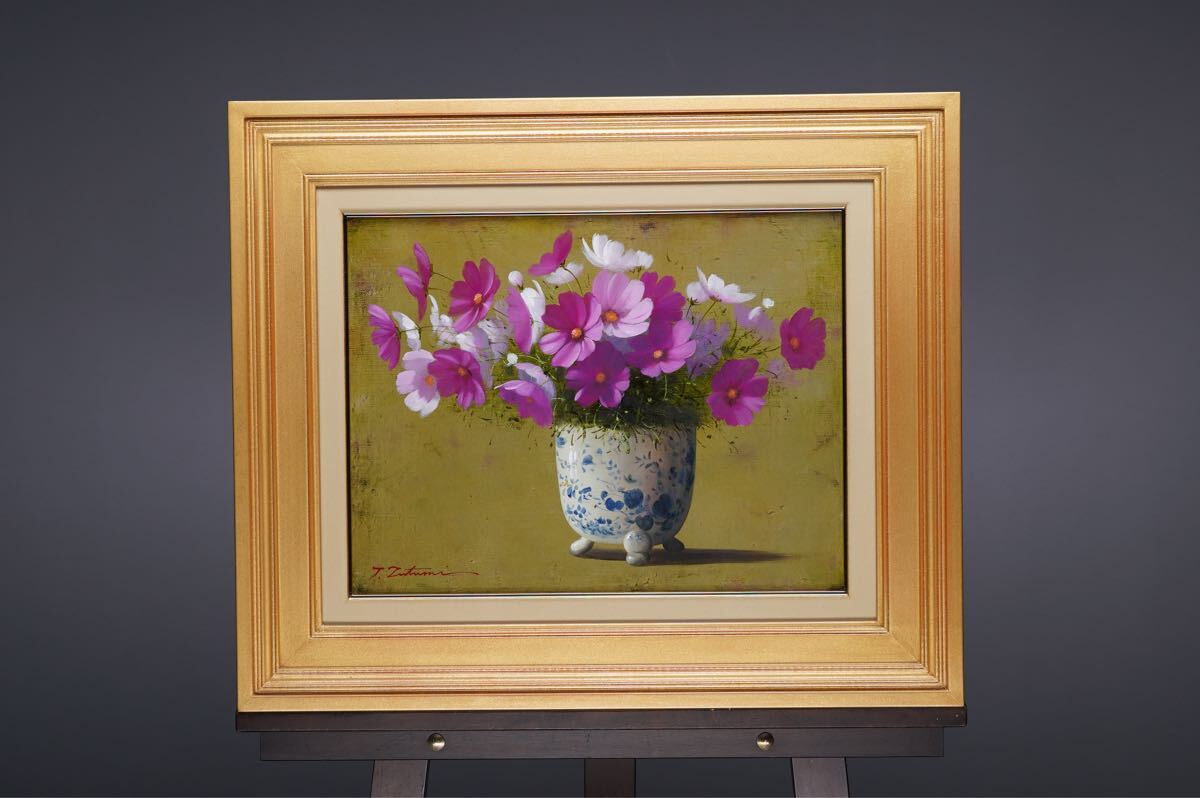 - 真作保証 堤照男「コスモス」油絵 F6号(41cmx32cm) サイン・裏書あり 高級額縁付き 京都出身実力画家 リアリズムの花逸作 秋桜 写実