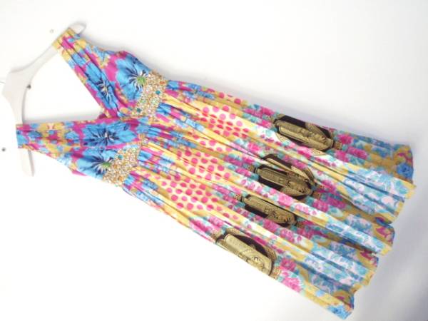 > ● MANOUSH マヌーシュ プリーツ ワンピース ハンド 36SM プリント生地 プリーツ ラインストーン ゴールド ドレープ エレガンス パーティー
