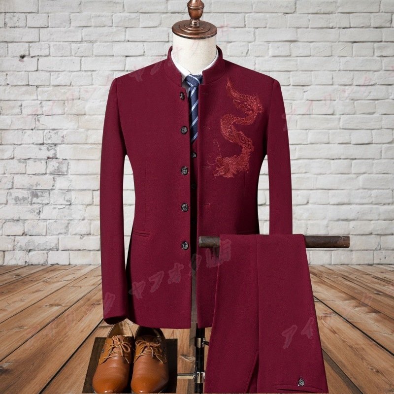 > ☆新品お色選択可ピーススーツビジネスメンズ刺繍チャイナ風 細身 龍 色サイズ選択可 ワインレッド ジャケット+ベストM-3XL パンツW28-36