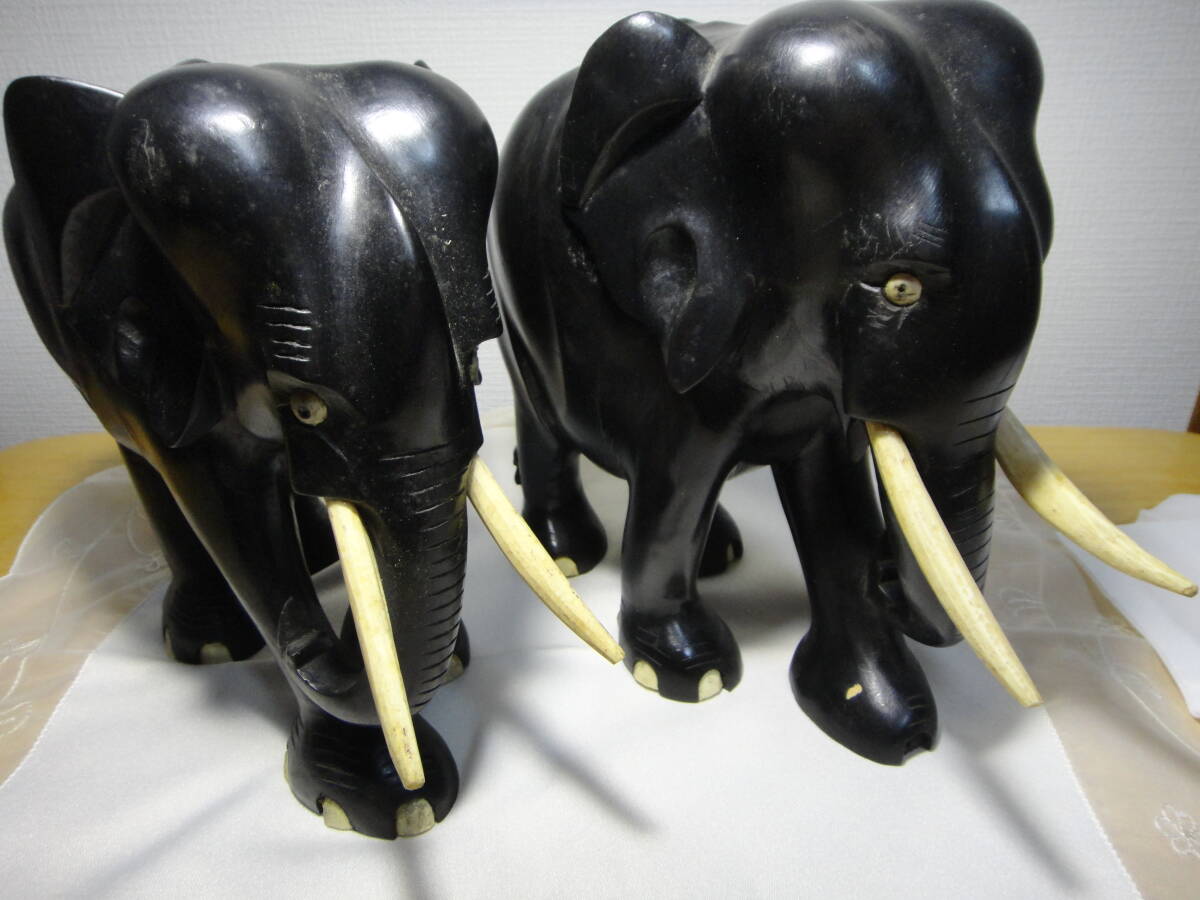 - 天然石 撫順産! 石炭精石 手彫り 工芸品 象 ぞうさん 置物 2体セット 1点モノ!