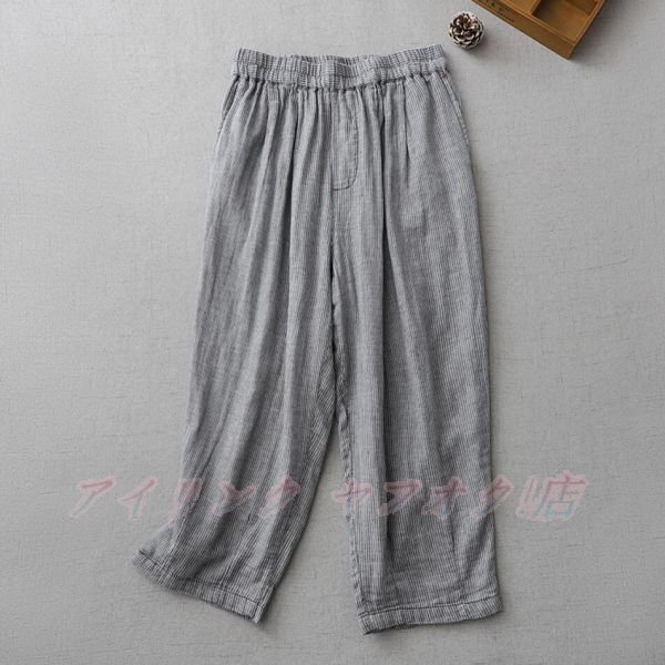 - ☆新品サイズ選択可 秋 レディースボトムス 大人 ボーダー柄 カジュアル ゆったり 綿麻 パンツ サルエルパンツ 深灰