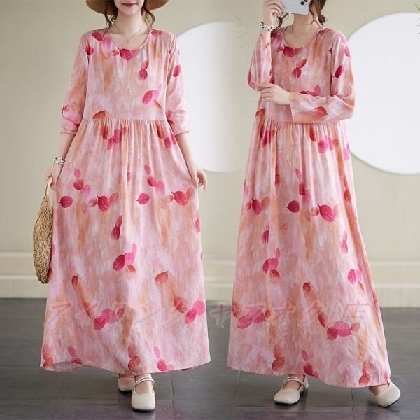 > ☆新品サイズ選択可 秋 ワンピース マキシワンピース かわいい ロング丈 長袖 花柄 着痩せ 綿麻 ロングワンピース N