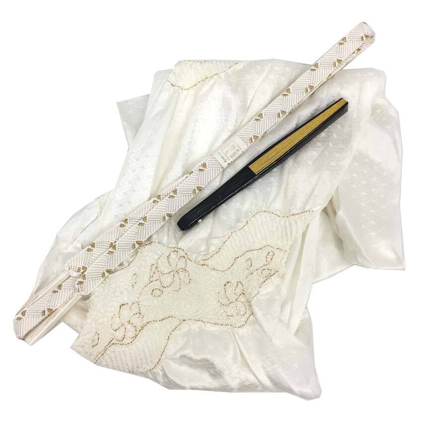 - 京やQ631 正絹 和装小物 帯揚げ 帯締め 末広 3点セット 留袖用 色留袖用 白地に金糸 流水 花 部分絞り 高級手組 未使用