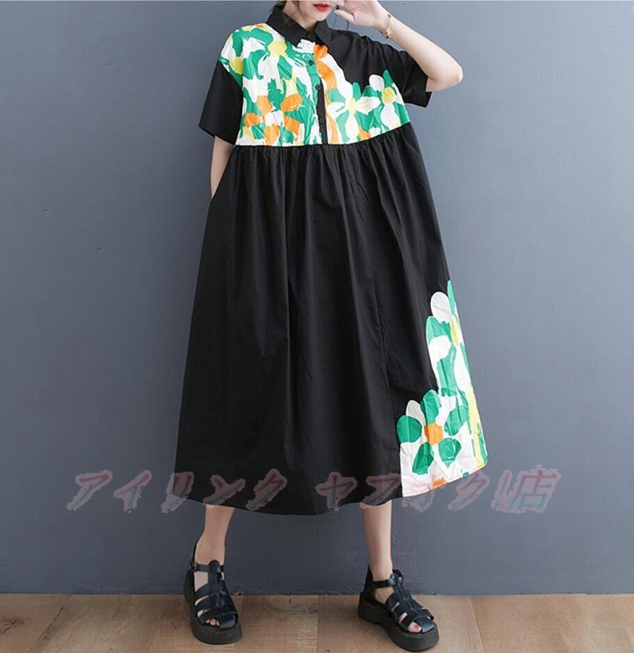 > ☆新品ロングワンピース ロング丈ワンピース きれいめ プリント切り替え 大きいサイズ 森ガール シャツワンピース ブラック