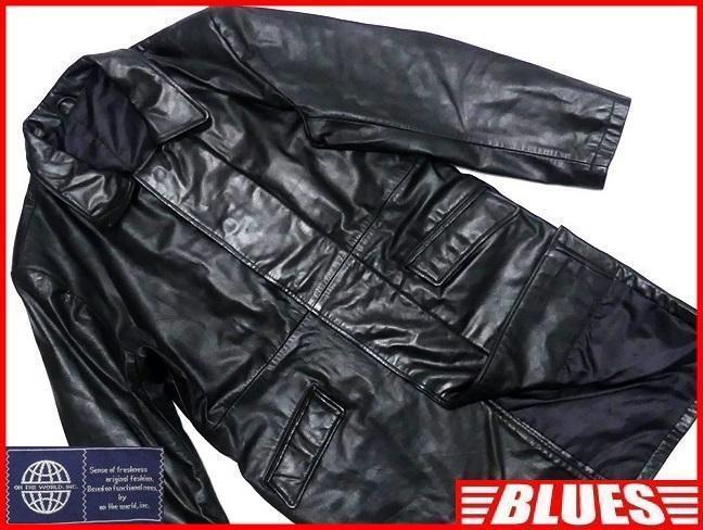 - 即決★on the world.inc★メンズM レザーロングコート オンザワールド 黒 ブラック 本革 ジャケット 本皮 ビジネス ステンカラー 革ジャン