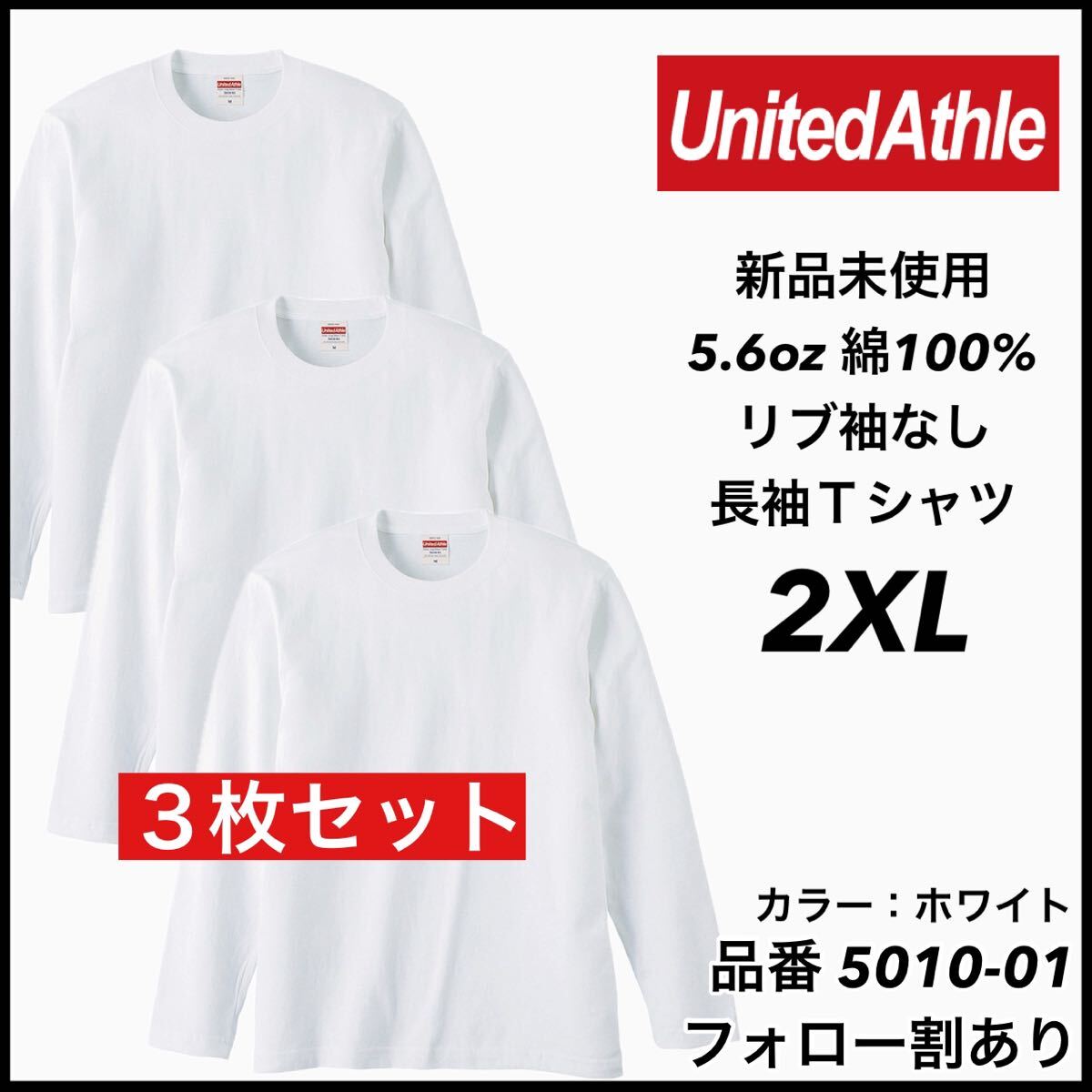 - 新品未使用 ユナイテッドアスレ United Athle 5.6oz 無地 袖リブなし 長袖Tシャツ ロンT 白3枚セット 2XLサイズ ユニセックス