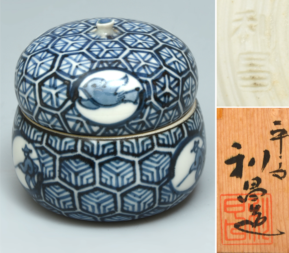 > 平安 利昌(造)染付亀甲小紋 青華蓋物 香合にも 共箱 陶磁器 煎茶道具 懐石道具 茶道具 加藤利昌 z8325o