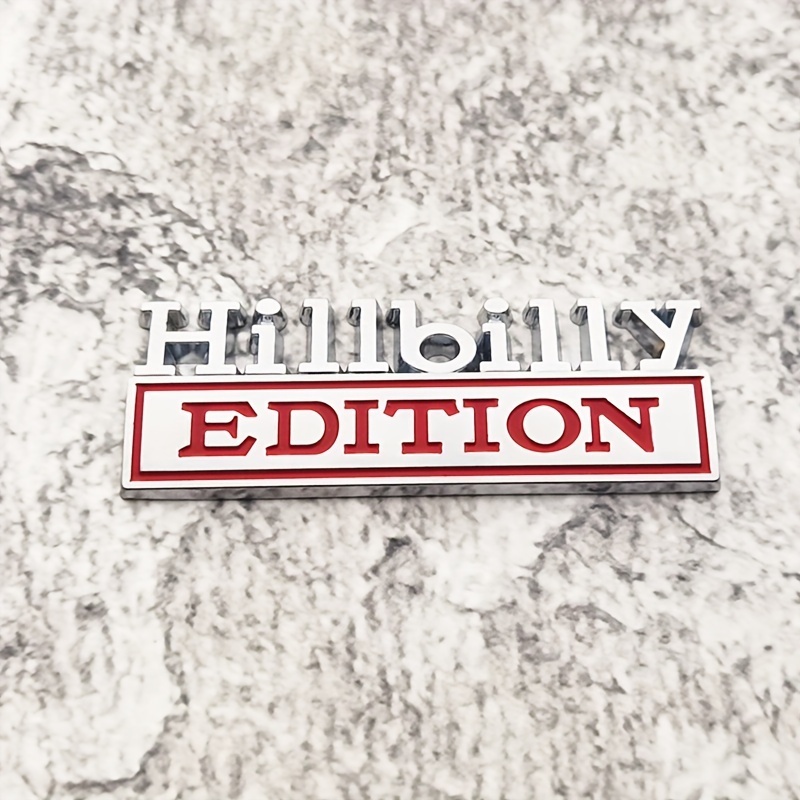 - エンブレム Hillbilly Edition 立体 8cm シルバー レッド 銀赤 ステッカー 金属 車外アクセサリー 車用 ロゴ バイク おしゃれ シール t3440