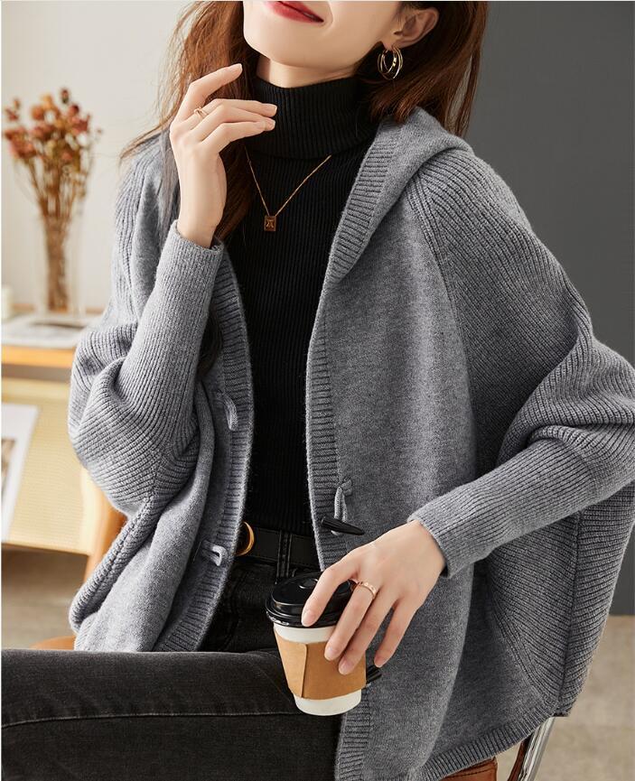- 秋新品* パーカー レディース ニットカーディガン フード付き 長袖 羽織 カジュアル 体型カバー オフィス 通勤 ニットセーター*グレー