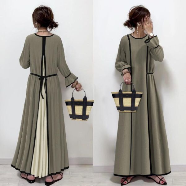 - 人気推薦 / 上質 Aラインワンピース 長袖 カジュアル 大人気 重ね着風 ロック 配色柄 切り替え 通勤 着やせ ロングワンピース /