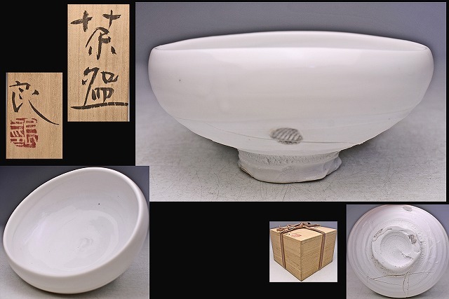 > 鯉江良二 ★ 白磁 沓 茶碗 ★ 共箱 栞 ★ 重みが心地良い白磁作品で貝の目跡も景色となった氏独特の造形見事な逸品 ★ 常滑の鬼才 ★茶道具
