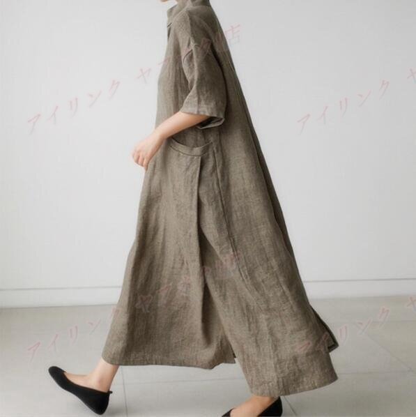 - ☆新品カジュアル グレージュ ロングワンピース ロングワンピ シンプル 綿麻 リネン Vネック
