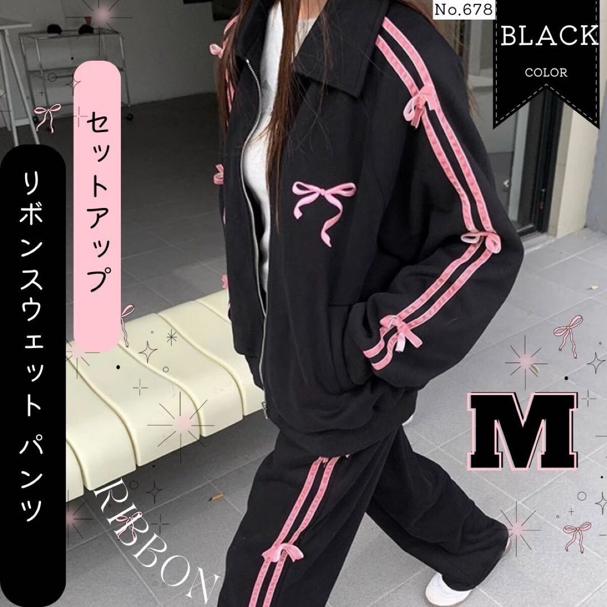 - 韓国 リボン スウェット セットアップ ブラック M 上下セット 地雷