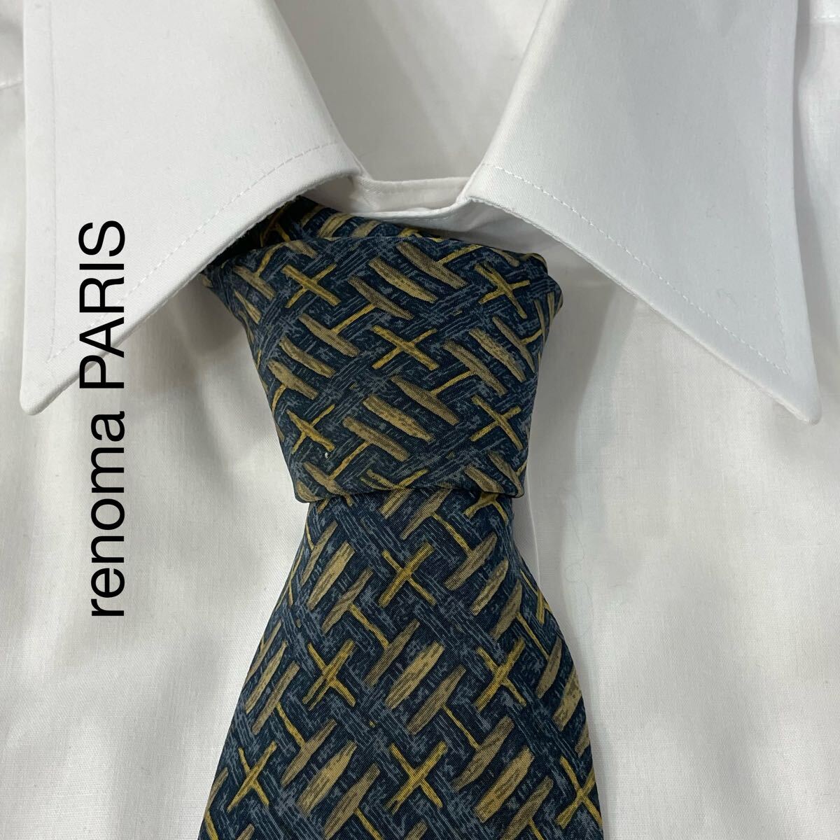 - renoma PARIS レノマパリス パターン柄 シルク ネクタイ イタリア製 ネイビー オーカー ブラウン系 TG454