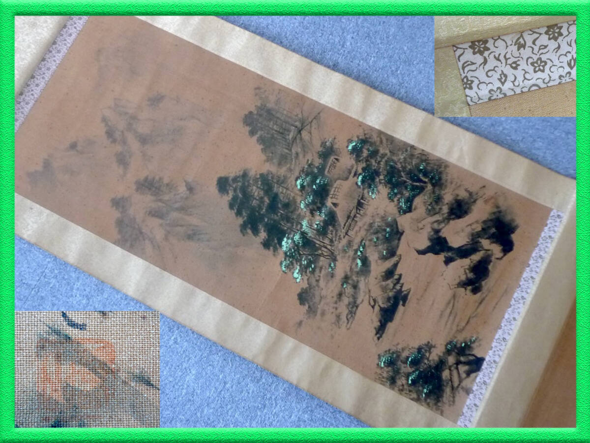 - 旧家蔵出 激レア 掛軸 水墨 山水 風景 銘有 銘印 在銘 絹本 貴重 掛け軸 茶道具 伝統工芸 巻物 東洋 希少 書道具 古美術 必見 お買得⑤
