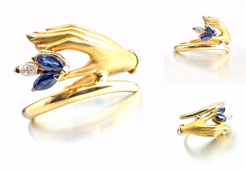 - 美品 Carrera y Carrera カレライカレラ K18 YG 幸せの手 ダイヤモンド サファイア ハンド リング マーキス 指輪 10号 ゴールド