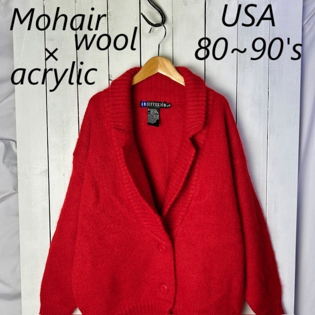 > USA古着 80s~90s 厚手 モヘアウール×アクリル ニットカーディガンジャケット L~XL 赤 オールド ヴィンテージ モヘアカーディガン ●278