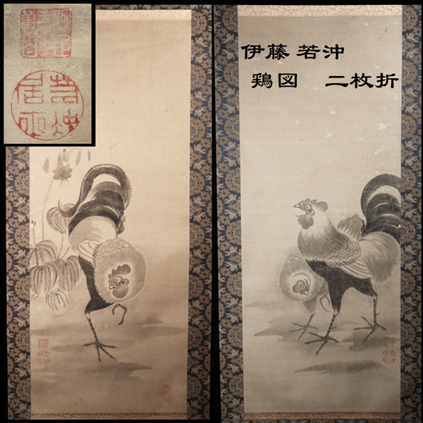> 模写 ◆雅◆ 江戸中期絵師 伊藤若沖 肉筆 鶏図 日本画 水墨画 掛軸 京都画家 /HK.24.3 [H21] UV
